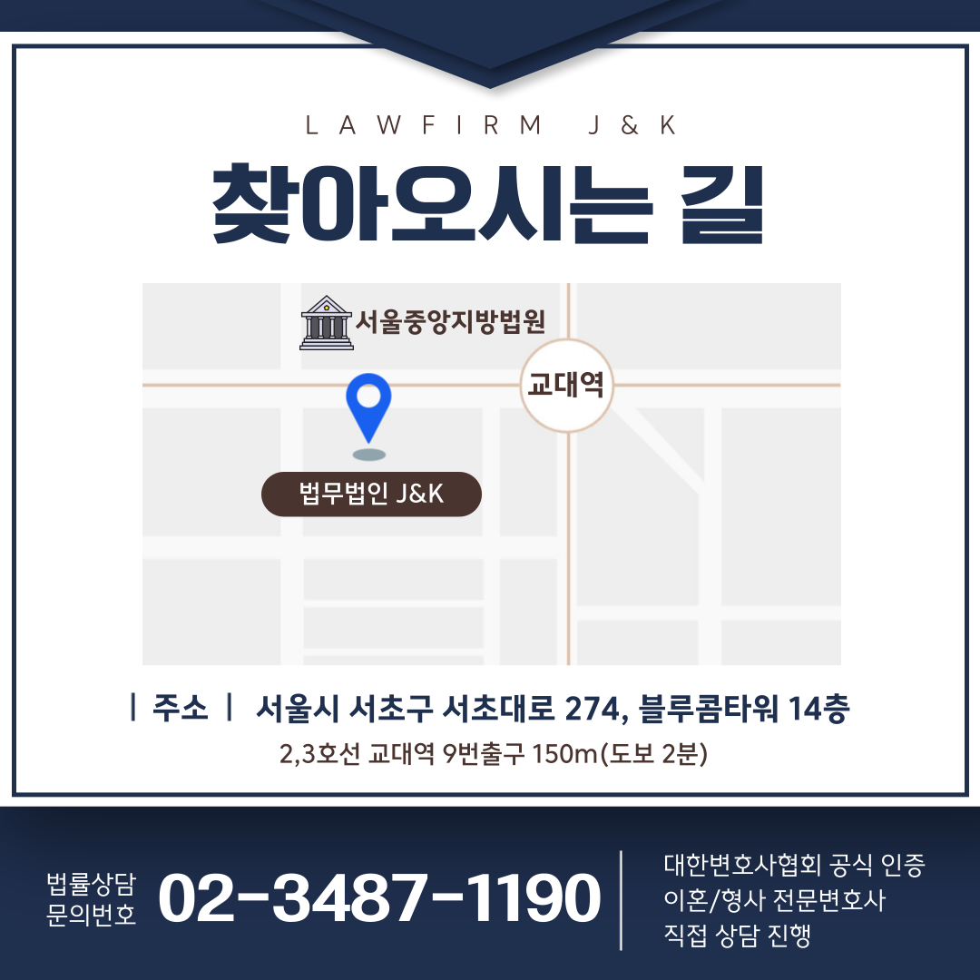 상호 : 법무법인 제이앤케이 주소 : 서울시 서초구 서초대로 274, 블루콤타워 14층